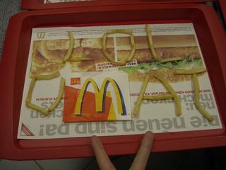 Hendrik zeigt selbst zu später Stunde noch hemmungslose Kreativität, die selbst vor Kartoffelstäbchen keinen Halt macht. Gekonnt stellt er aus 15 Fritten und einer kleinen McDonald's Frittentüte den LoL-o-Mat Schriftzug her.