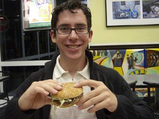 Tobi ist mit einem frischem Burger zurückgekehrt und freut sich, dass er so überzeugend in die Kamera grinsen kann.