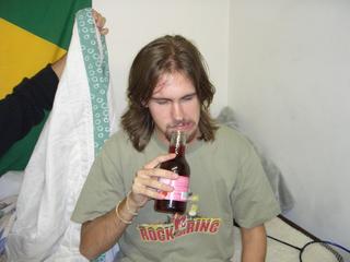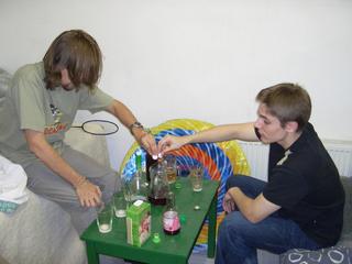 Hendrik öffnet das nächste zu testende Getränk, den Fruchtsirup (Erdbeer). Was Phils Arm, links im Bild, mit der Decke vorhat bleibt im Dunkeln.