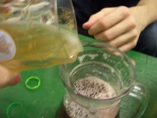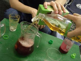 Da die Beiden Brausetabletten keinerlei Anstalten machen sich ihrem Auflösungsprozess hinzugeben entscheiden wir, dass es der Hilfe von weniger dickflüssigen Getränken bedarf. Wir schütten Apfelsaft und Apfelschorle hinzu.