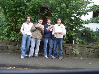 Auf der Suche nach einem geeigneten Ort für den Wettkampf (der in grauen Vorzeiten olympische Disziplin war) fahren wir mit dem Auto an dem Haus von LoL-o-Mat-Helfer Felix vorbei und entscheiden uns spontan, dort unser Vorhaben durchzuführen. Ein Glück, dass unser Motor wie ein rolliges Kätzchen schnurrt, sodass Felix unser Kommen nicht bemerkt und sich nicht vor unserer Ankunft in den Luftschutzbunker unter dem Haus retten kann. Fortuna ist auf unserer Seite.
