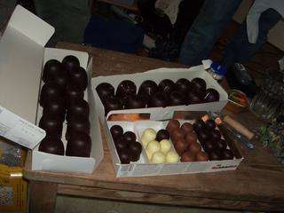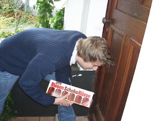 Nach einer kurzen Erklärung unseres Vorhabens zwingen wir Felix zur Mitarbeit. Die Schoko-Küsse werden ausgepackt und begutachtet.