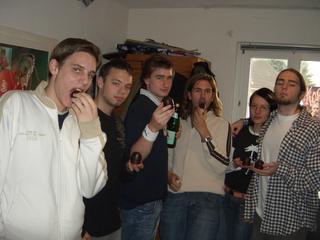 Das glorreiche Team und ihre Helfer. Von links nach rechts: Marian, LoL-o-Mat-Helfer Phil und Kim, Hendrik, Felix' Lebensabschnittsgefährtin Sandra und Sandras Lebensabschnittsgefährte Felix, der auch die gemütlichen Räumlichkeiten zur Verfügung gestellt hat.